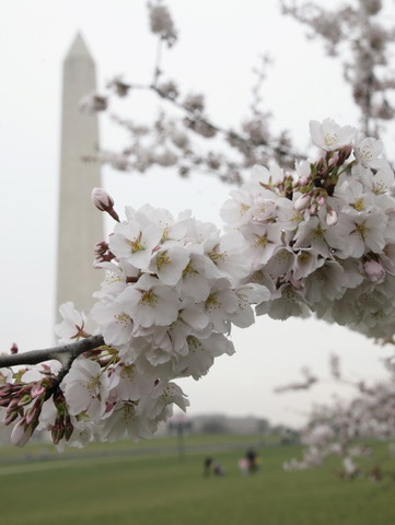Cherry blossoms begin to bloom near the Washington Monument in Washington on March 27, 2008. [Agencies]