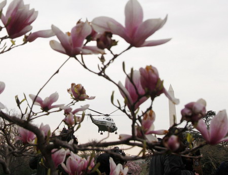 Marine One carrying U.S. President George W. Bush is framed by a magnolia tree as he departs the South Lawn at the White House in Washington March 27, 2008. [Agencies]
