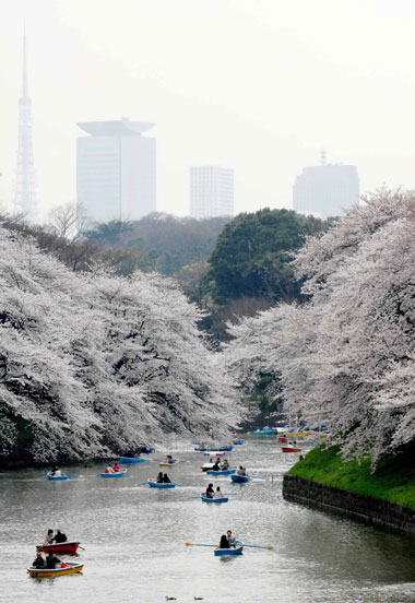 Tourists row boats under cherry blossom trees at a park in Tokyo March 28, 2008. [Xinhua]