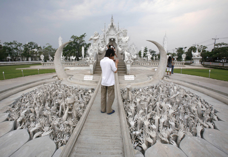 A tourist photographs a detail of the hall of a temple of Wat Rong Khun (Rong Khun temple) in Thailand's Chiang Rai province, north of Bangkok, March 30, 2008. [Agencies]