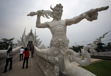 Tourists walk towards the hall of a temple of Wat Rong Khun (Rong Khun temple) in Thailand's Chiang Rai province, north of Bangkok, March 30, 2008. [Agencies]