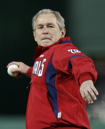 US President George W. Bush throws out the ceremonial first pitch at Nationals Park in Washington, March 30, 2008. The Washington Nationals baseball team played their first regular season game at their new home, Nationals Park, against the Atlanta Braves on Sunday. [Agencies]