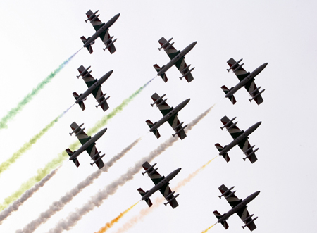 Italian Air Force's team "Frecce Tricolore" perform in the sky above Florence March 31, 2008. [Agencies]