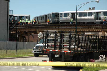 Rescue workers arrive at the scene where a four-car train derailed in Chicago's South Side, US, May 28, 2008. Twenty-four people were reported injured. [Xinhua]