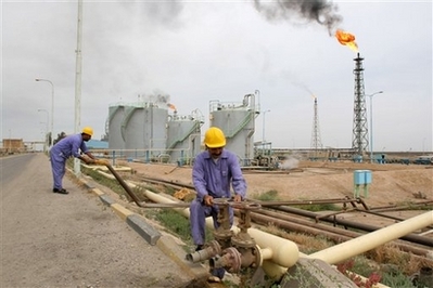 A refinery worker controls a valve on a pipeline at an oil refinery in Basra, 550 kilometers (340 miles) southeast of Baghdad, Iraq, in this photo taken March 2007. Next week several major oil companies are expected to announce contracts to start servicing the Iraqi oil infrastructure. [Agencies]