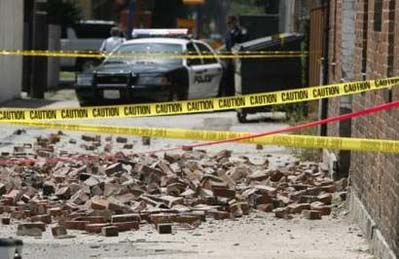 Bricks that fell from a building during a 5.4 magnitude earthquake are seen in an alleyway in Pomona, California July 29, 2008. The moderate earthquake struck east of Los Angeles on Tuesday and was felt hundreds of miles south to the Mexican border and east to Las Vegas, but there were no reports of injuries, major damage or power outages. [Agencies]