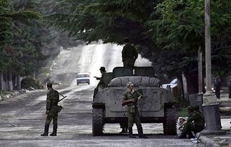 Russian soldiers keep watch on the road in Tskhinvali. US Secretary of State Condoleezza Rice and French President Nicolas Sarkozy called Thursday for Moscow and Tbilisi to rapidly sign a six-point ceasefire to end their conflict. [Agencies]