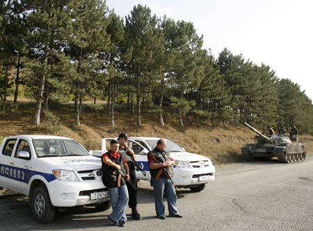 Russian troops (R) and Georgian police stand at a joint checkpoint on the main road to Tbilisi near the town of Gori, some 80 km (50 miles) from the capital, August 14, 2008. Russian President Dmitry Medvedev pledged support on Thursday for Abkhazia and South Ossetia fighting for independence from Georgia, as Washington demanded that the war-torn country's territorial integrity be respected. [Agencies]