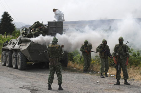 Russian troops stand at a main road near the Georgian town of Gori, some 80 km (50 miles) from Tbilisi, August 14, 2008. [Agencies]