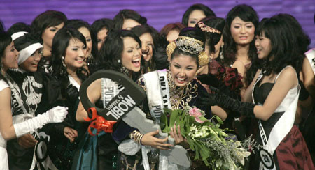 Winner of the Miss Indonesia beauty contest Zivanna Lethisa Siregar (C) celebrates with other contestants during the pageant's final in Jakarta August 15, 2008. Thirty-three contestants from 38 provinces in Indonesia took part in the pageant. [agencies]