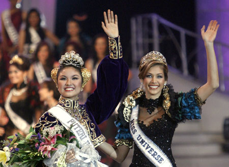 Miss Universe 2008 Dayana Mendoza of Venezuela (R) poses with winner of the Miss Indonesia beauty contest Zivanna Lethisa Siregar during the pageant's final in Jakarta August 15, 2008. Thirty-three contestants from 38 provinces in Indonesia took part in the pageant. [Agencies]