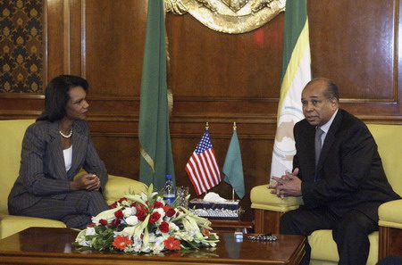 Libya's Foreign Minister Abd al-Rahman Shalgham meets with US Secretary of State Condoleezza Rice (L) in Tripoli September 5, 2008. Rice met Libyan leader Muammar Gaddafi -- once reviled as a "mad dog" by a US president -- on Friday on a historic visit which she said proved that Washington had no permanent enemies. [Agencies]