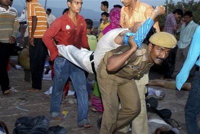 A group of 200 pilgrims jostled with the crowd and tried to move ahead of others, causing some people to slip down the narrow 1.35-mile path leading to the temple, said Mahendra Singh Nagar, who heads a private trust that oversees the temple's operations. False rumors of a bomb added to the chaos, worshippers said. Tensions are high because India has been hit by a spate of recent bomb attacks. Temple floors were also slick with coconut milk as thousands of devotees broke coconuts as religious offerings, causing pilgrims to slip and fall as they scrambled to escape, Nagar said. |