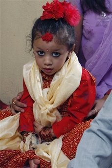 Matani Shakya, 3, newly appointed 'kumari,' or living goddess in Nepal, looks on as farewell rituals are performed before taking her to kumari house in Katmandu, Nepal, Tuesday, Oct. 7, 2008. [Agencies]