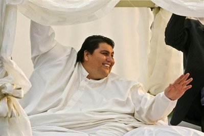 Updated: 2008-10-28 08:05 MONTERREY, Mexico – The world's heaviest man has tied the knot. Manuel Uribe, who hasn't left his bed in six years, married his longtime girlfriend Claudia Solis Sunday in northern Mexico. Wearing a white silk shirt with a sheet wrapped around his legs, Uribe smiled as Solis, 38, walked down a flight of stairs wearing a strapless ivory dress, a tiara and hot-pink lipstick. He later broke into tears as a notary declared the couple husband and wife in a civil ceremony attended by more than 400 guests. For the traditional first dance as newlyweds, Uribe and Solis held hands and swayed to a romantic ballad. A popular local norteno band played accordion-heavy tunes at the reception, which featured a banquet of meat and buttered vegetables. Uribe's mother, Orquedia Garza, said the groom steered clear of the five-tier wedding cake. "He didn't break his diet," she said. "His doctors are here and they are watching him very closely." The wedding, which was closed to most media, will be featured in an upcoming Discovery Channel documentary on Uribe, the 43-year-old former mechanic said. "I have a wife and will form a new family and live a happy life," Uribe told hordes of reporters earlier as they followed him through the streets of Monterrey. A flatbed truck was brought in to tow his custom-made bed decorated with a canopy, flowers and gold-trimmed bows to the wedding at a local event hall. Two police patrol cars escorted him ahead of a long line of traffic. Uribe tipped the scales in 2006 at 1,230 pounds (560 kilograms), earning him the Guinness World Record as the world's heaviest man. He has since shed about 550 pounds (250 kilograms) with the help of Solis, whom he met four years ago. Uribe said he's gunning for a new title: world's greatest weight loser. |
