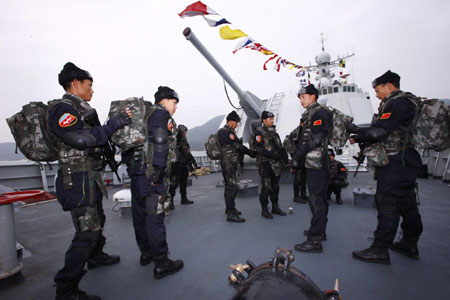 Soldiers of Chinese navy special force prepare for the departure in Sanya of South China's Hainan Province on Dec. 25, 2008. The Chinese Navy's three-ship fleet awaiting sail to waters off Somalia has finished its preparations for the overseas deployment, the fleet commander said Thursday.[Xinhua]