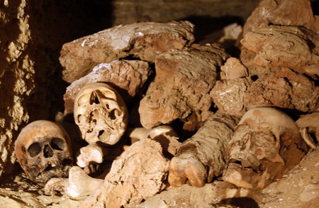 Human remains are found by Egyptian archaeologists at the Step Pyramid of Saqqara, one of the earliest large stone structures in the world, February 11, 2009. Egyptian archaeologists have found about 30 mummies and at least one unopened sarcophagus in a burial chamber about 4,300 years old, the government said. [Agencies]