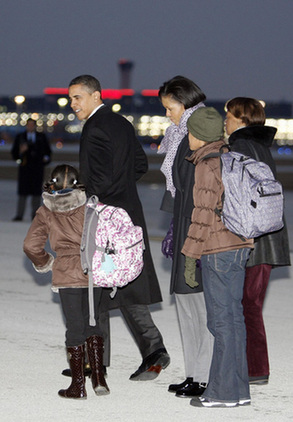 US President Barack Obama, first lady Michelle Obama, daughters Malia and Sasha and Michelle's mother Marian Robinson arrive in Chicago February 13, 2009, to spend the Presidents Day holiday weekend at their home in Chicago. [Agencies]