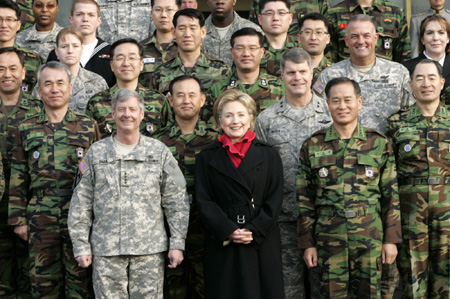 US Secretary of State Hillary Rodham Clinton (bottom C) poses with officers of Commander of US Forces Korea upon her arrival at Yongsan Garrison in Seoul February 20, 2009. At bottom center left is Commander of US Forces Korea General Walter Sharp. [Agencies]