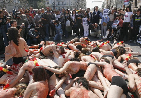 Animal rights activists covered in fake blood protest during a demonstration calling for the abolition of bullfights on the second day of the "Fallas" festival in Valencia March 16, 2009. [Agencies]