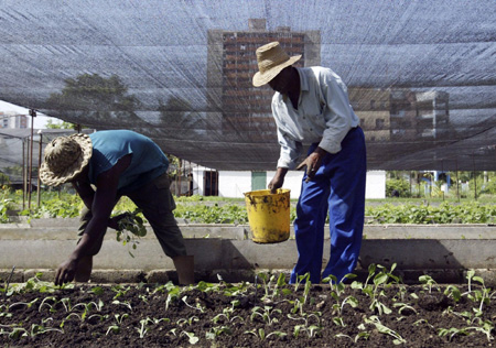 Men work in an urban garden in Havana August 11, 2009. [Agencies]