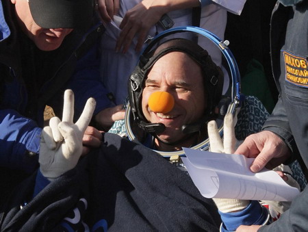 Laliberte, who wore a bulbous clown nose during his stay aboard the International Space Station, was extracted from the Soyuz capsule Sunday morning following its landing in the steppes of northern Kazakhstan. Laliberte returned to Earth with Russian cosmonaut Gennady Padalka and NASA astronaut Michael Barratt, several hours after their capsule left the International Space Station. Valery Lyndin, spokesman for Russian mission control, said the landing took place at 10:32 am local time. Russian television showed pictures of Padalka sitting outside the spacecraft eating an apple and drinking tea as ground crew extracted the other space travelers from the cramped capsule.