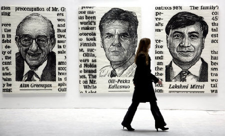 A female passerby observs the works of artist Jose-Maria Cano during "The Wall Street 100" at the Riflemaker Dairy in Bloomsbury, London. [CFP]
