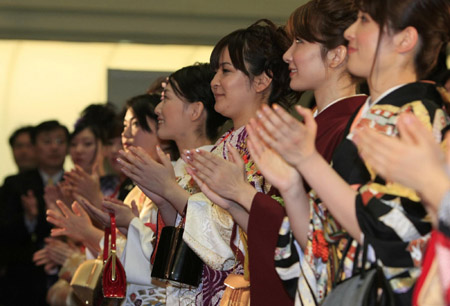 ![]() Kimono clad women applaud at the opening ceremony of the stock market and launching of the "Arrowhead" system at the headquarters of Tokyo Stock Exchange January 4, 2010. [Agencies] |