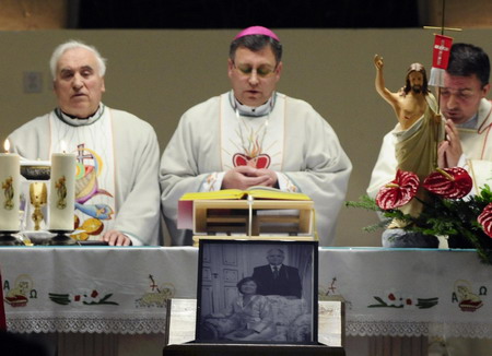 Priests pray next to a portrait of the late Polish President Lech Kaczynski and his wife Maria during a special service at a church Jesus Hart chapel in Skopje, April 10, 2010.[Agencies]