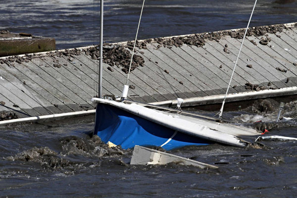 A boat slowly sinks in the Santa Cruz Harbor in Santa Cruz, California March 11, 2011. [Photo/Agencies] |