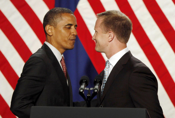 ![]() US President Barack Obama (L) is introduced by former US army captain Jonathan Hopkins at a gala fundraiser for the homosexual community in New York City June 23, 2011. Hopkins was discharged in 2010 because he is homosexual. [Photo/Agencies] |
