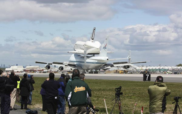 Space Shuttle Enterprise rides atop a NASA modified 747 plane as it lands at JFK airport in New York, April 27, 2012. [Photo/Agencies] |