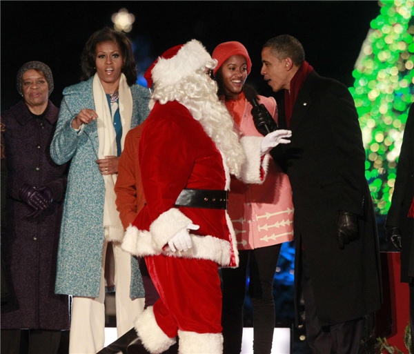 US President Barack Obama, first lady Michelle Obama (2nd L), their daughters and an actor dressed as Santa Claus sing "Santa Claus is coming to town" as they participate in the 90th lighting of the National Christmas tree in front of the White House in Washington, Dec 6, 2012. [Photo/Agencies] |
