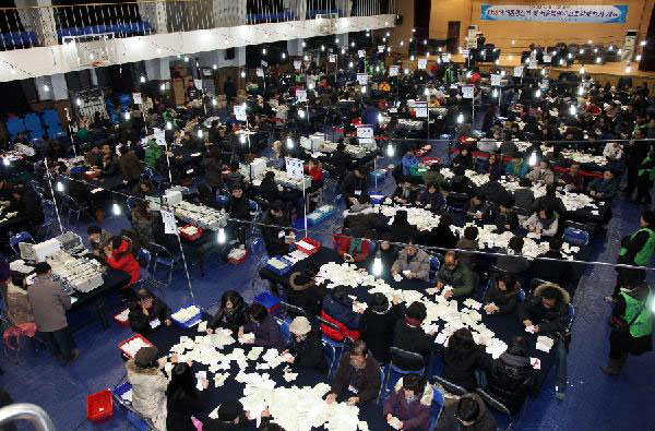 Election officials count the ballots of the presidential election in Seoul, on Dec 19, 2012. [Photo/Xinhua] |