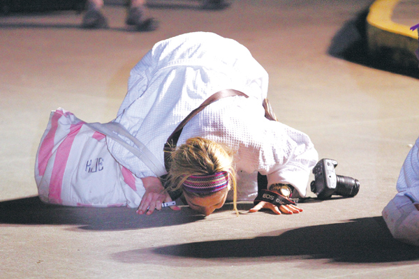 Passenger Kendall Jenkins kisses the ground after stepping off the cruise ship Triumph at the Alabama Cruise terminal in Mobile, Alabama, on Thursday. The ship arrived at the port, ending a nightmarish ocean voyage for some 4,000 desperate passengers and crew members after it lost power over the weekend. Dan Anderson / Agence France-Presse