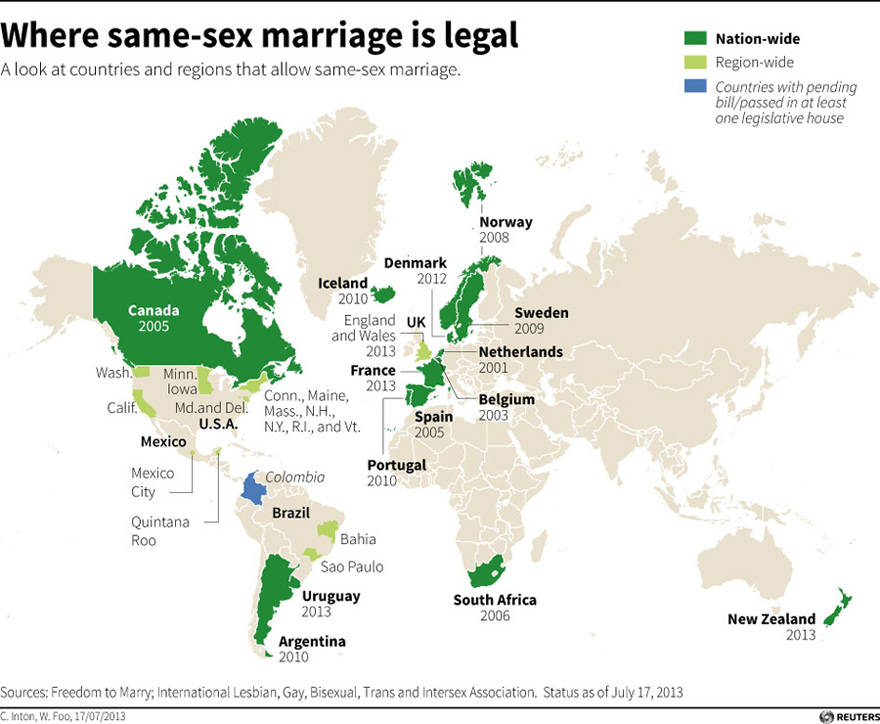 Editor's note: Gay marriage is to become legal in England and Wales after the lower house of the British parliament approved the final changes to a law that had Prime Minister David Cameron's backing. Last month, the US Supreme Court delivered a landmark victory for gay rights by forcing the federal government to recognize same-sex marriages in states where it is legal and paving the way for it in California, the most populous state. The same-sex marriage has been again under the worldwild spotlight, along with a decades long controversy on whether same-sex marriage should be accepted legally. |