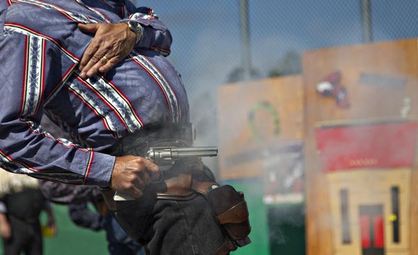 Frank Lawton of Deadwood, South Dakota fires his single action revolver after cocking the gun with his left hand during the Canadian Open Fast Draw Championships in Aldergrove, British Columbia July 21, 2013. The present-day Fast Draw competition was born from the Hollywood myth of the western gunfighter, and the idea is to draw a single action revolver from a holster, and cock, fire and hit a designated target in the shortest possible time. No live ammunition is ever used, only blank cartridges or wax bullets. The targets are either a metal silhouette used with wax bullets or balloons that burst from the muzzle blast from the blank cartridges. A light atop the timer signals the competitor when to fire and once the target is hit, it turns the timer off, measuring the speed to thousandths of a second. Picture taken July 21, 2013.[Photo/Agencies]
