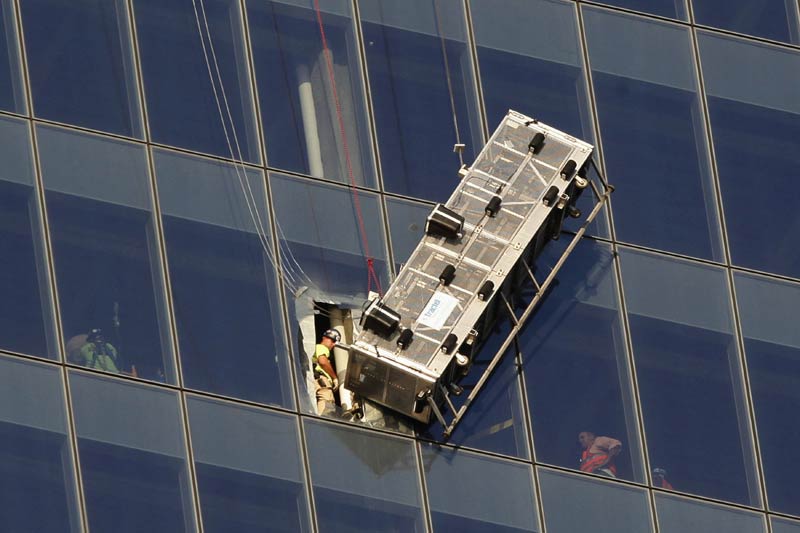 Workers look out at a broken scaffolding that had stranded window washers earlier on the side of 1 World Trade Center in New York November 12, 2014. Two window washers caught on dangling scaffolding on the 69th floor of New York City's 1 World Trade Center were pulled to safety on Wednesday through a window cut in the tallest US skyscraper, a building official said. [Photo/Agencies] |