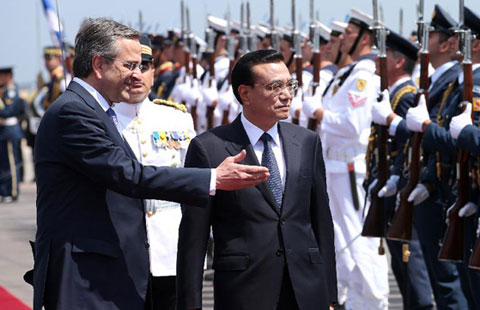 Premier Li Keqiang is scheduled to meet with top Greek leaders, including President Karolos Papoulias and Prime Minister Antonis Samaras.