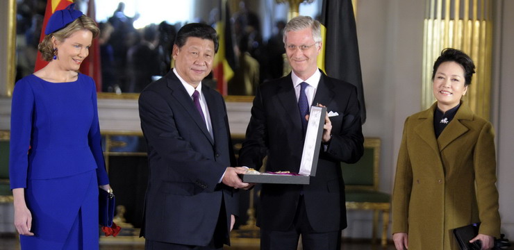 Belgium's Queen Mathilde and China's first lady Peng Liyuan visit the Musical Instruments Museum ( MIM ) and the Sax 200 exhibition, March 31, 2014.