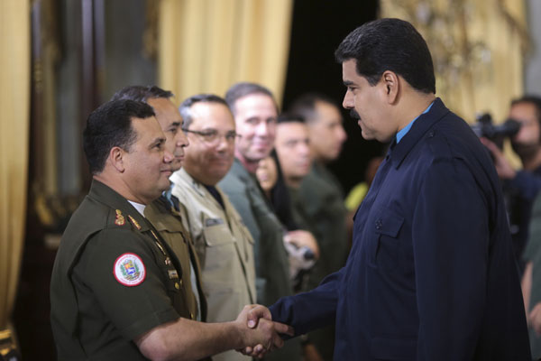 Venezuela's President Nicolas Maduro (R) greets Gustavo Gonzalez as he welcomes army members sanctioned by the US during a national TV broadcast in Caracas in this March 9, 2015 picture provided by Miraflores Palace. [Photo/Agencies] |