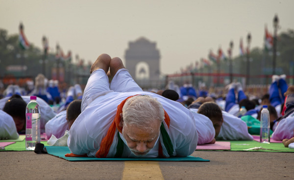 Indian Prime Minister Narendra Modi performs yoga along with thousands of people in New Delhi, India, on Sunday. Millions of yoga enthusiasts around the world participated in a mass yoga exercise to mark International Yoga Day. [Photo/Agencies]