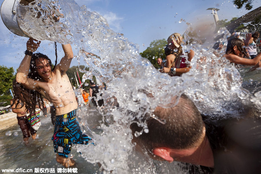 People pour water over each other during a water battle in Lausanne, Switzerland, July 3, 2015 as the temperature rose above 35 degrees Celsius. [Photo/IC]