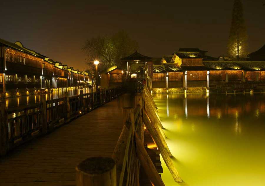 A night view of Wuzhen township, host of the World Internet Conference, in Tongxiang city, East China's Zhejiang province, on Dec 14, 2015. [Photo by Wang Chengmeng/chinadaily.com.cn]