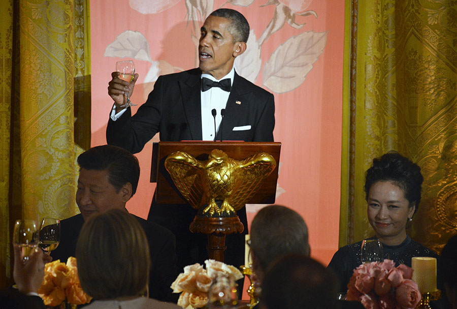 US President Barack raises his glass in a toast to Chinese President Xi Jinping as Peng Liyuan joins in, during the state dinner at the White House, in Washington, Sept 25, 2015. [Photo/Agencies]