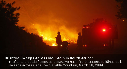 A massive bush fire sweeps across Cape Town's Table Mountain, March 18, 2009, causing hundreds of people to be evacuated as the flames threatened buildings.