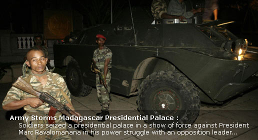 Around 100 soldiers backed by tanks stormed the Madagascan presidency on Monday in a show of force by the military which is pressuring President Marc Ravalomanana to leave office.