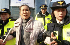 Police say a South Korean woman tried to set herself on fire near the Seoul convention center where the Group of 20 leaders' summit will take place.