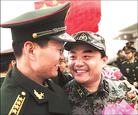 ![]() Chinese medical team members are welcomed back at the Beijing Capital International Airport on Wednesday after completing a 15-day mission in Haiti. [Photo/Guan Xin] |