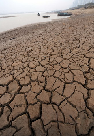 赣江南昌段北岸干枯的河滩(12月24日摄)。11月中旬以来,江西境内降雨稀少,赣江水位继续全线回落,继中游吉安、樟树、丰城等水文站突破历史最低水位以来,12月21日,南昌站水位再跌破极值,达到13.55米,比历史最低水位(13.61米)还低0.06米。面对日趋严重的旱情,江西省各级部门正采取紧急措施,确保城乡居民用水安全,努力减轻旱灾损失。